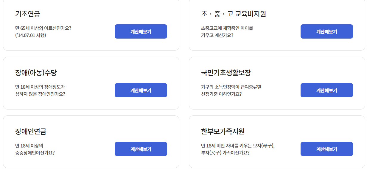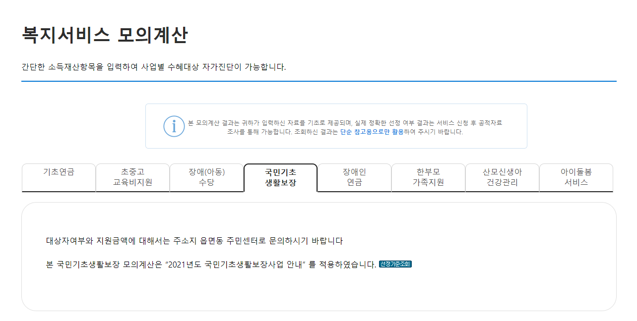 위의 모의계산을 사용하면 본인이 기초생활 수급자에 해당이 되는지 무료로 알아볼 수 있습니다. 뿐만 아니라 기초연금, 장애인 연금, 한부모 가족지원 등도 확인 가능하니 궁금하신 분들은 확인을 해보시기 바랍니다.